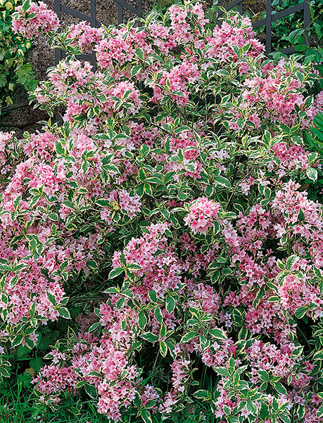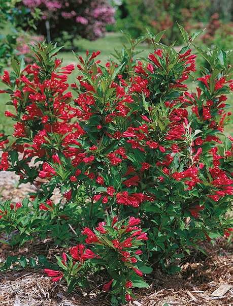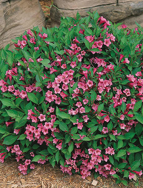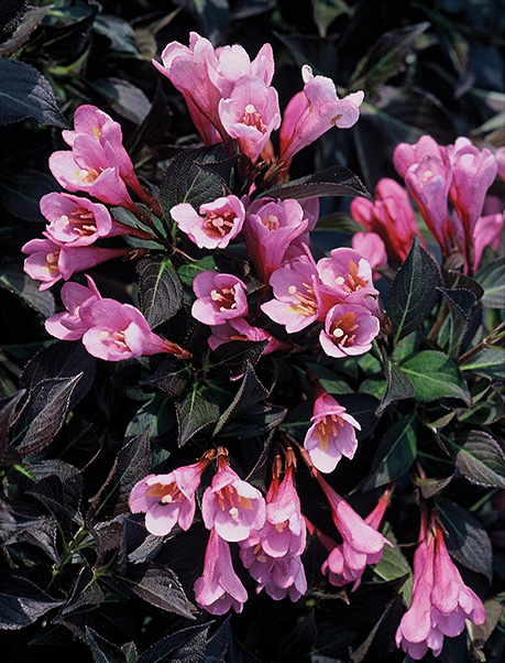 Rounded, multi-stemmed shrub with attractive rose colored trumpet shaped flowers that bloom late spring. Its foliage is reddish green in the spring changing to maroon summer through fall.