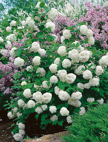 Large, ball shaped clusters of fragrant, bright white, double flowers bloom in late spring. Its green summer foliage turns yellow-red in the fall.