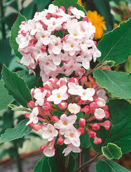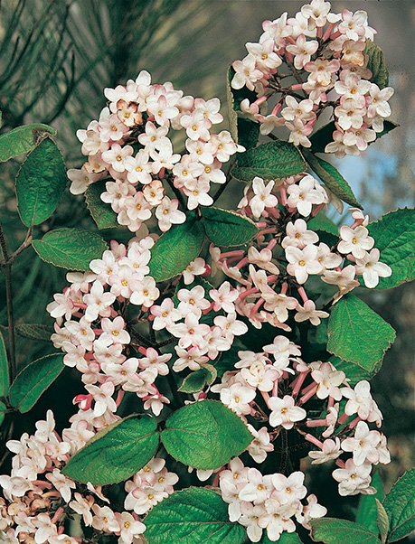 The flowers in early spring are semi-snowball, changing from pink to white. Produces black fruit.
