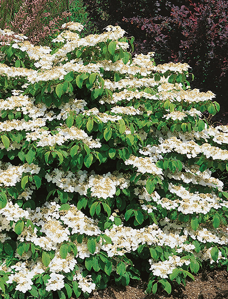 Creamy white flowers layered across the top of horizontal branches. Its foliage is green in the summer turning reddish purple in the fall.