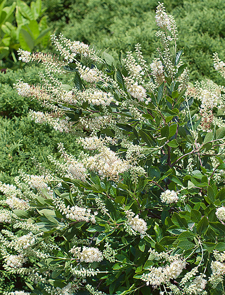 This is a dwarf form of the “Summer Sweet”. It is very compact & florific. For 4 to 6 weeks in the summer plants bear hundreds of white fragrant flowers. It has glossy green leaves which turn a good yellow before falling off in the fall.