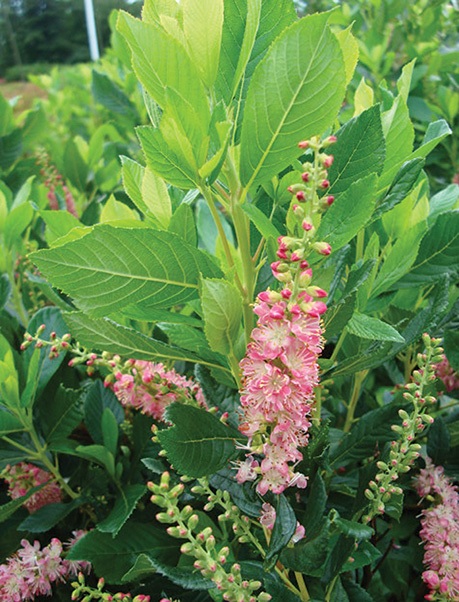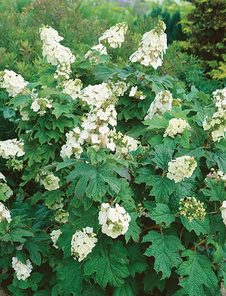 Unusually compact hybrid has many clusters of distinct, conical, pure white flowers that bloom into Fall over small, oak-shaped leaves featuring saw-toothed edges that provide excellent foliage texture and beautiful red fall interest.