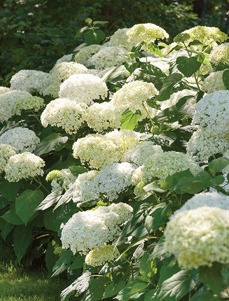 Huge, round creamy-white flowers bloom midsummer atop sturdy branches surrounded by medium green oval leaves.