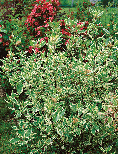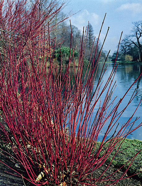 Best known for its brilliant red stems in winter. Large Multi-stemmed shrub with clusters of white flowers followed by small bluish fruits in late spring. Green leaves turn burgundy in fall.