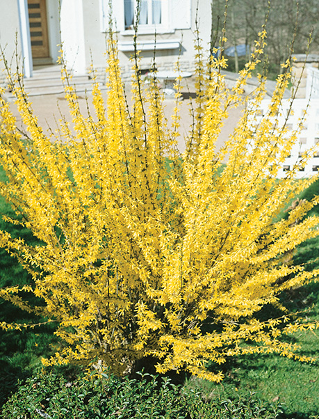 Brilliant yellow flowers cover the branches of this upright growing shrub in April; the following stems appear as yellow wands.