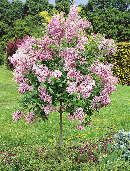 Upright deciduous tree displays lilac blooms later than others, extending the season with deep purple buds that reveal clusters of highly fragrant, lavender-blue flowers. Foliage is burgundy-tinged in fall.