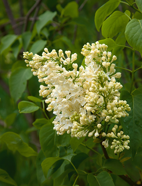 Elegant lilac with white panicles of fragrant, double white flowers and heart shaped fresh green leaves.