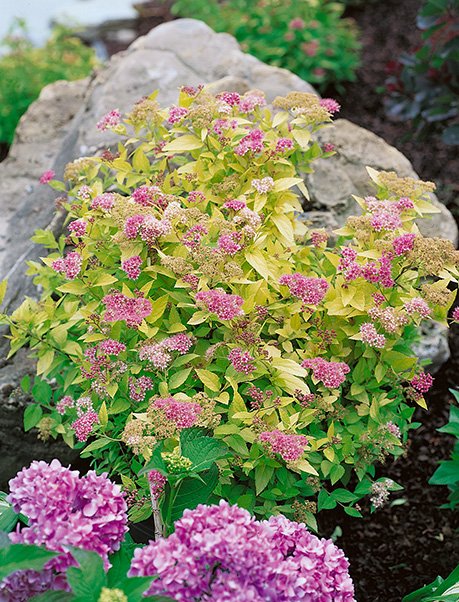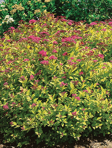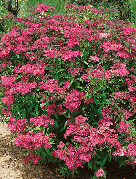 Bright pink, flat-topped flower clusters bloom early to midsummer. Reblooms in the fall if pruned after first flowering.