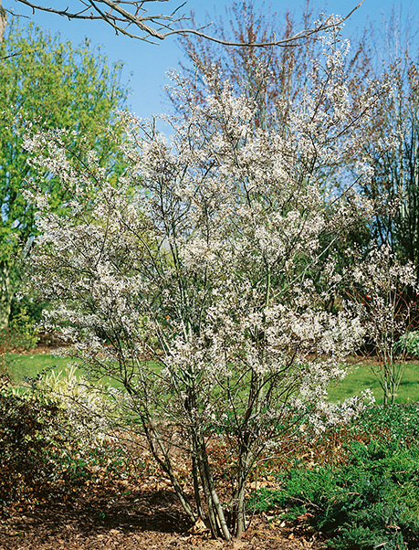 A shrub or small tree prized for its brilliant orange-red fall color and disease resistance. Clusters of fragrant white flowers give way to small purplish black fruit often used in jams and jellies.
