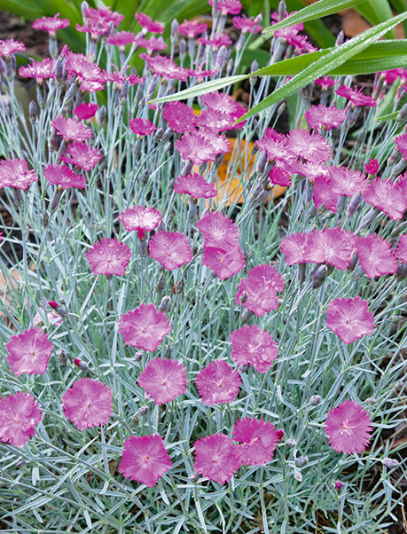 Long flowering German Hybrid with ice blue foliage forms a tidy mat that stays evergreen. Firewitch has brilliant pink single flowers that have frilled petals combined with a pleasing clove scent.