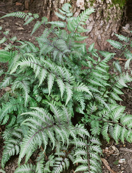 ‘Red Beauty’ features gray-green fronds highlighted with burgundy red stems and veins.