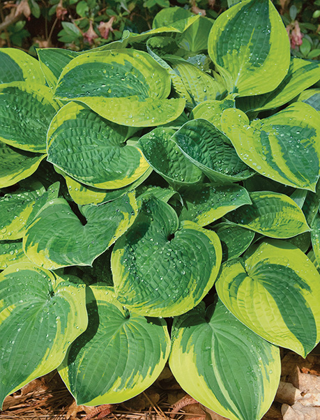 Large, pale lavender flowers bloom on tall 36” scapes, atop a mound of variegated foliage. Each leave is streaked with dark green margins surrounding an apple green center. In summer, the leaf turns bright.
