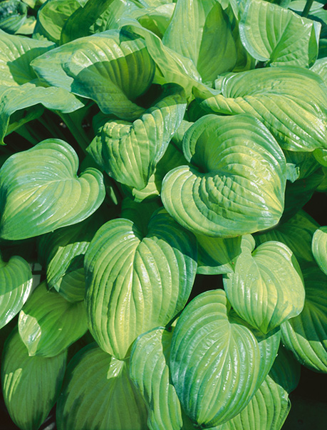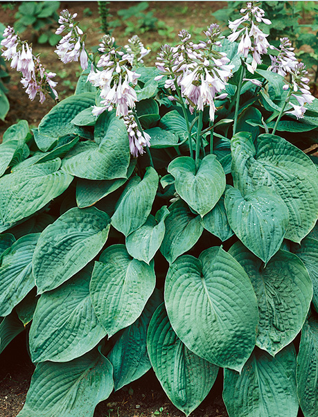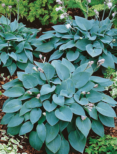 A sturdy and compact hosta, Halcyon has blue, heart-shaped leaves with heavy ribbing and towers of lavender flowers.