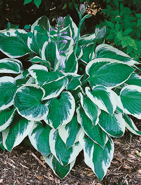Green leaves with wide, pure white margins and streaks of white toward the centers. Lavender flowers bloom on tall stalks midsummer.