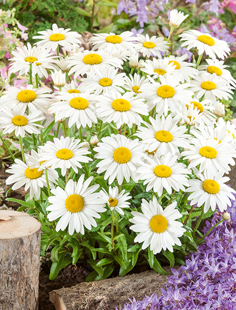 Very large, pure white flowers with yellow centers bloom all summer long above dark green foliage.